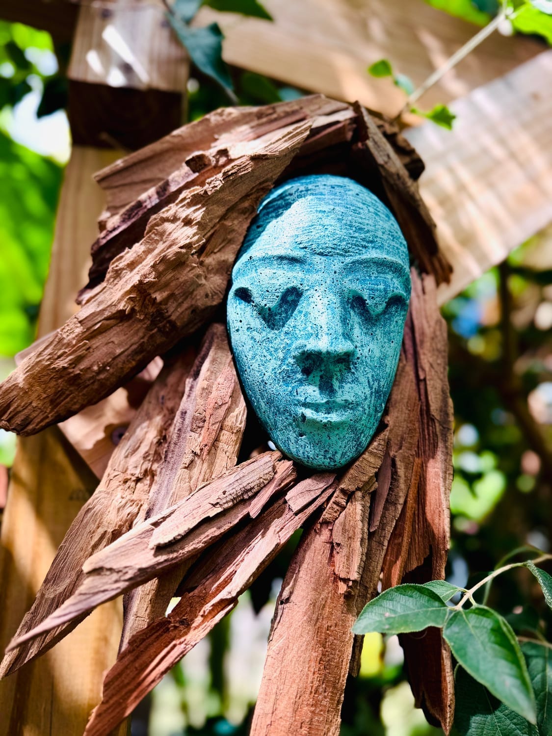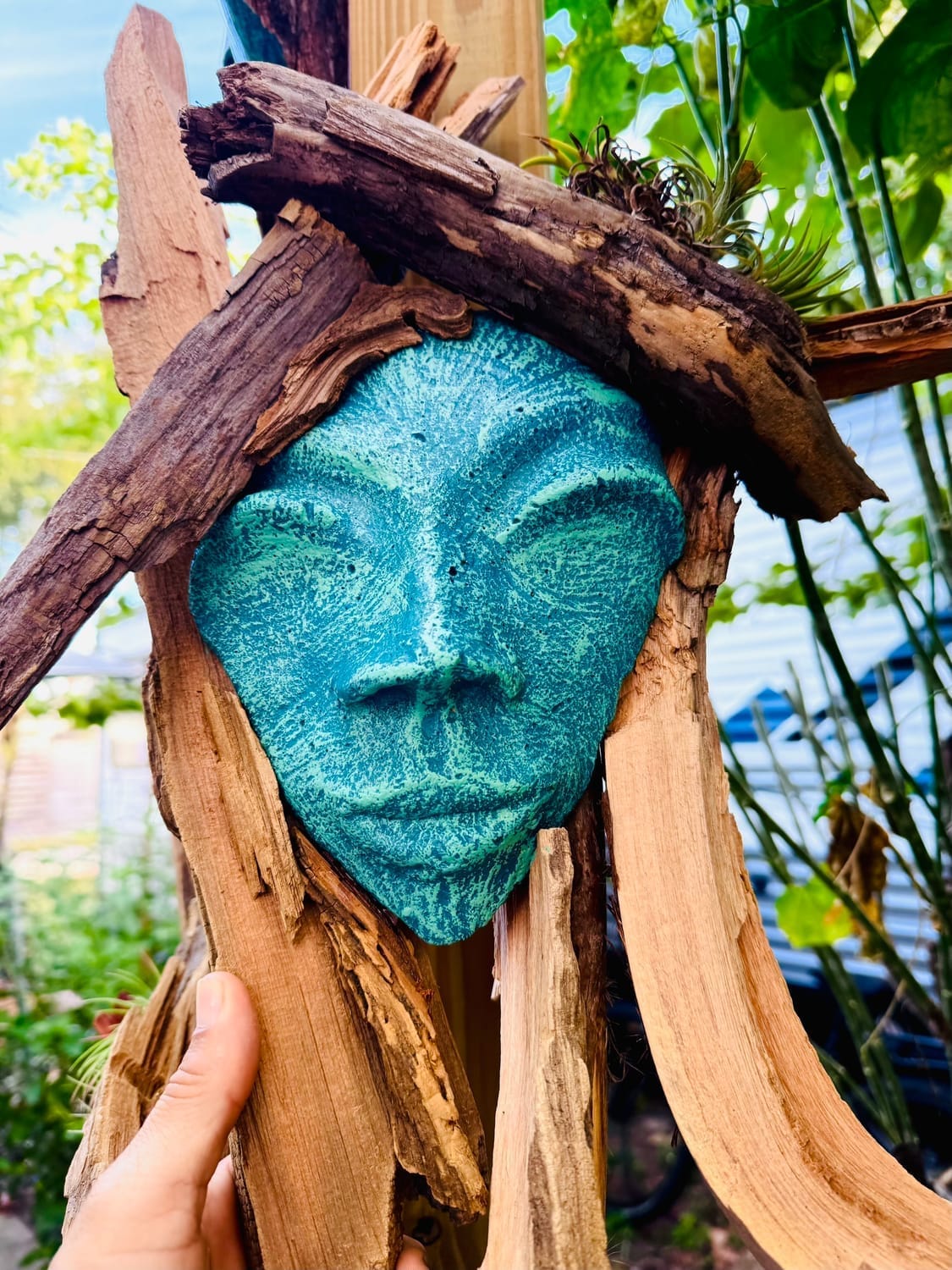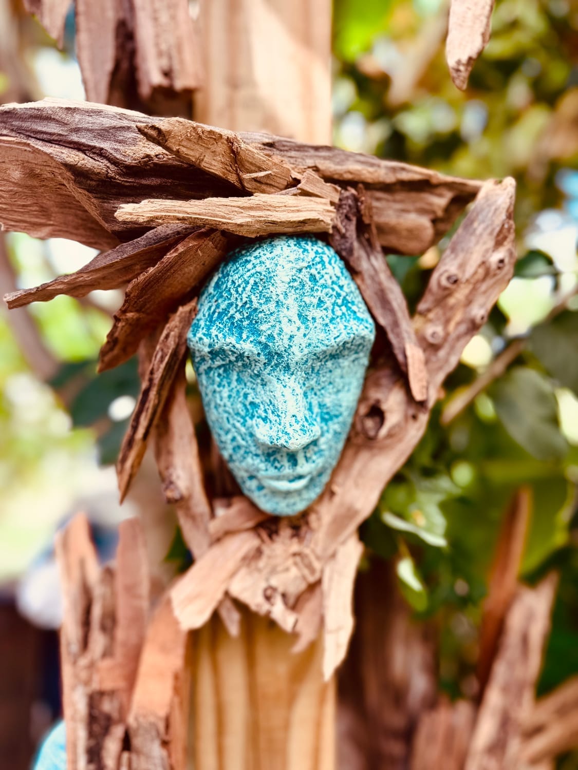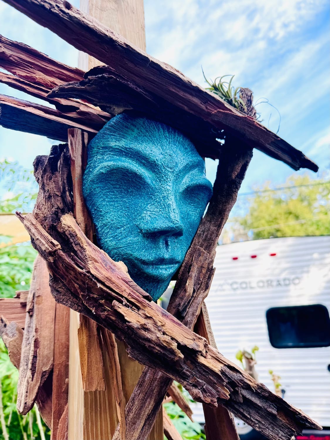 driftwood, clay, Pal Tiya clay, cement, rapid-set, paint, framed on treated wood.