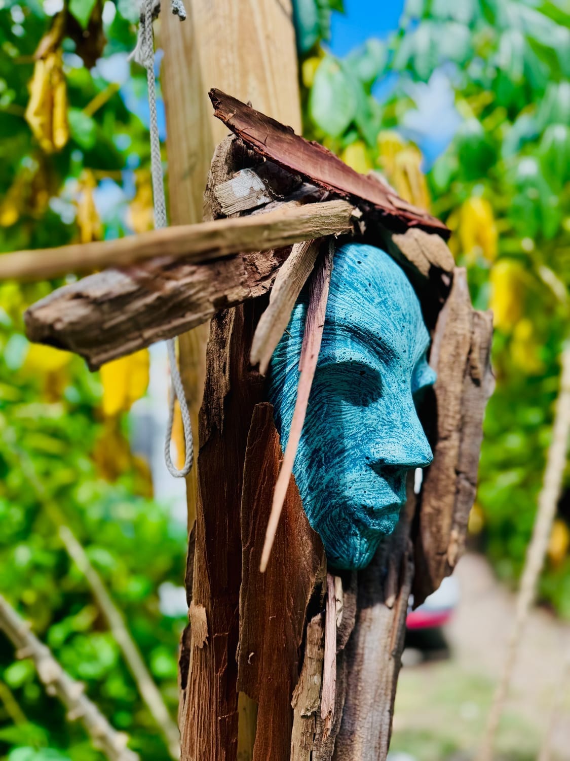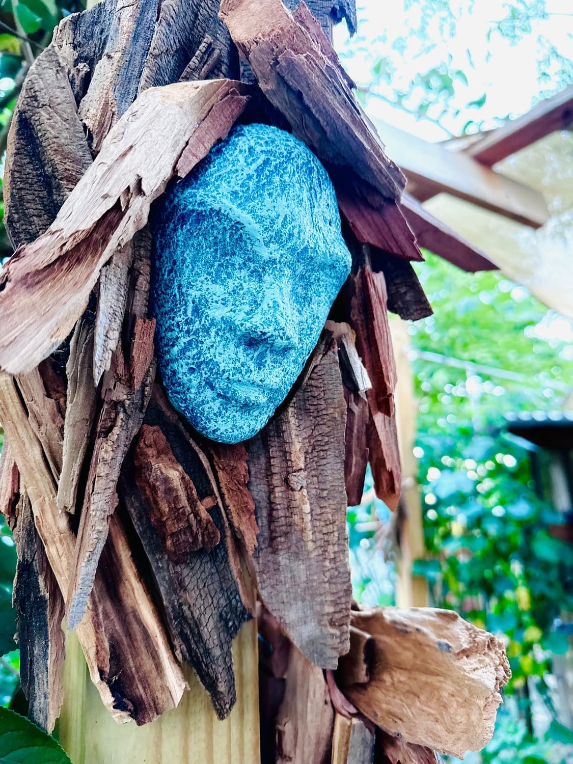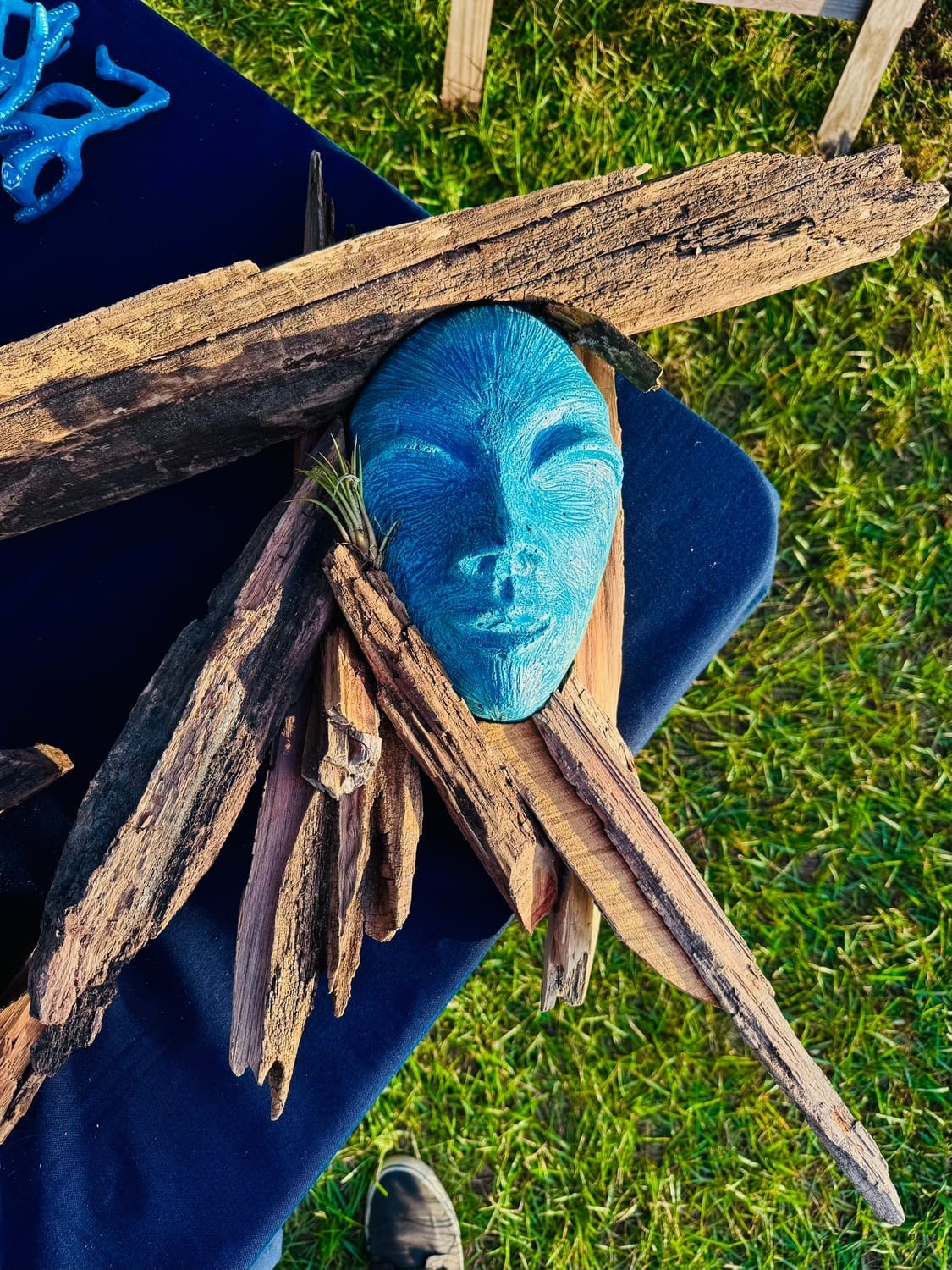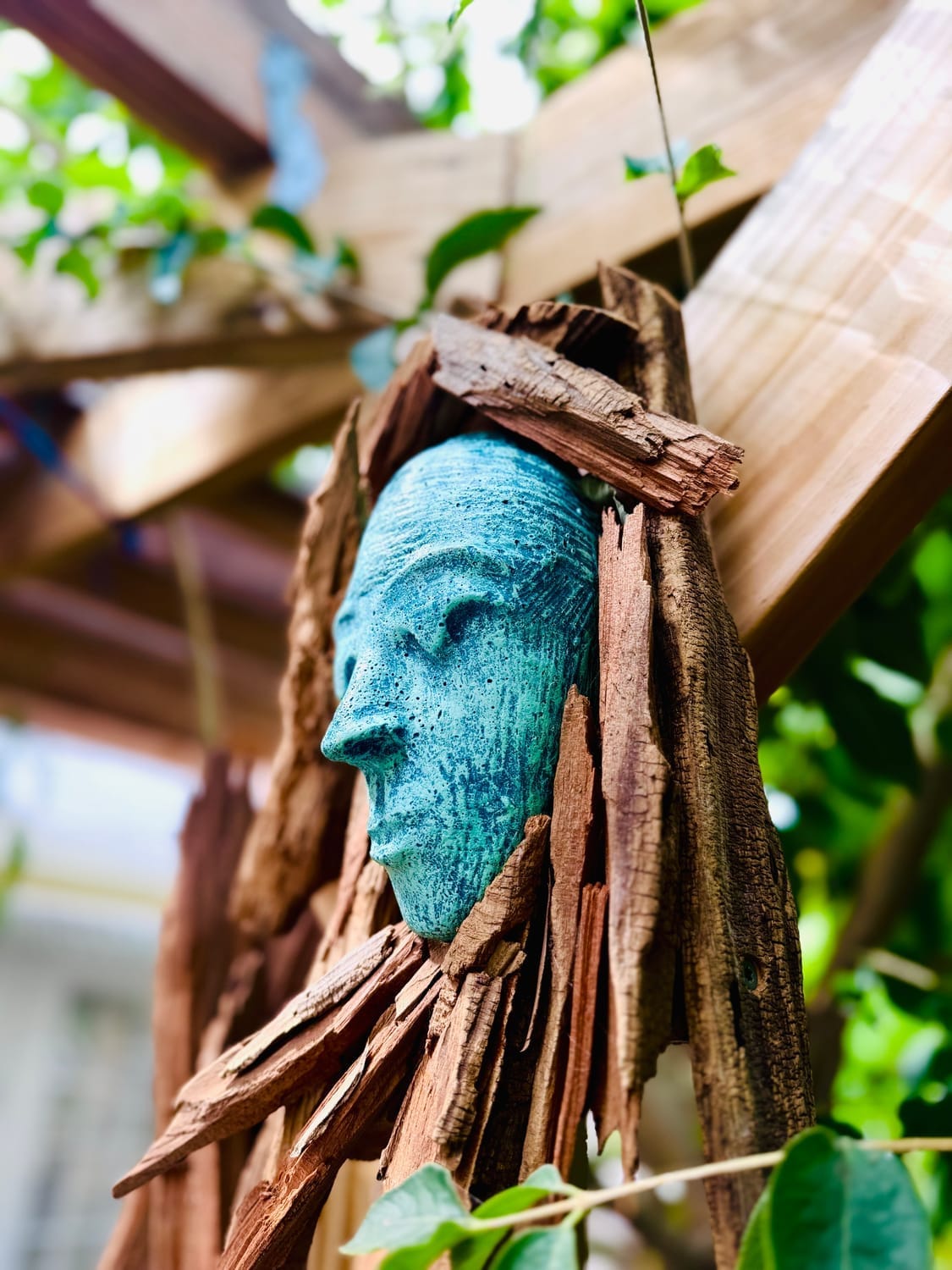driftwood, clay, Pal Tiya clay, cement, rapid-set, paint, framed on treated wood.