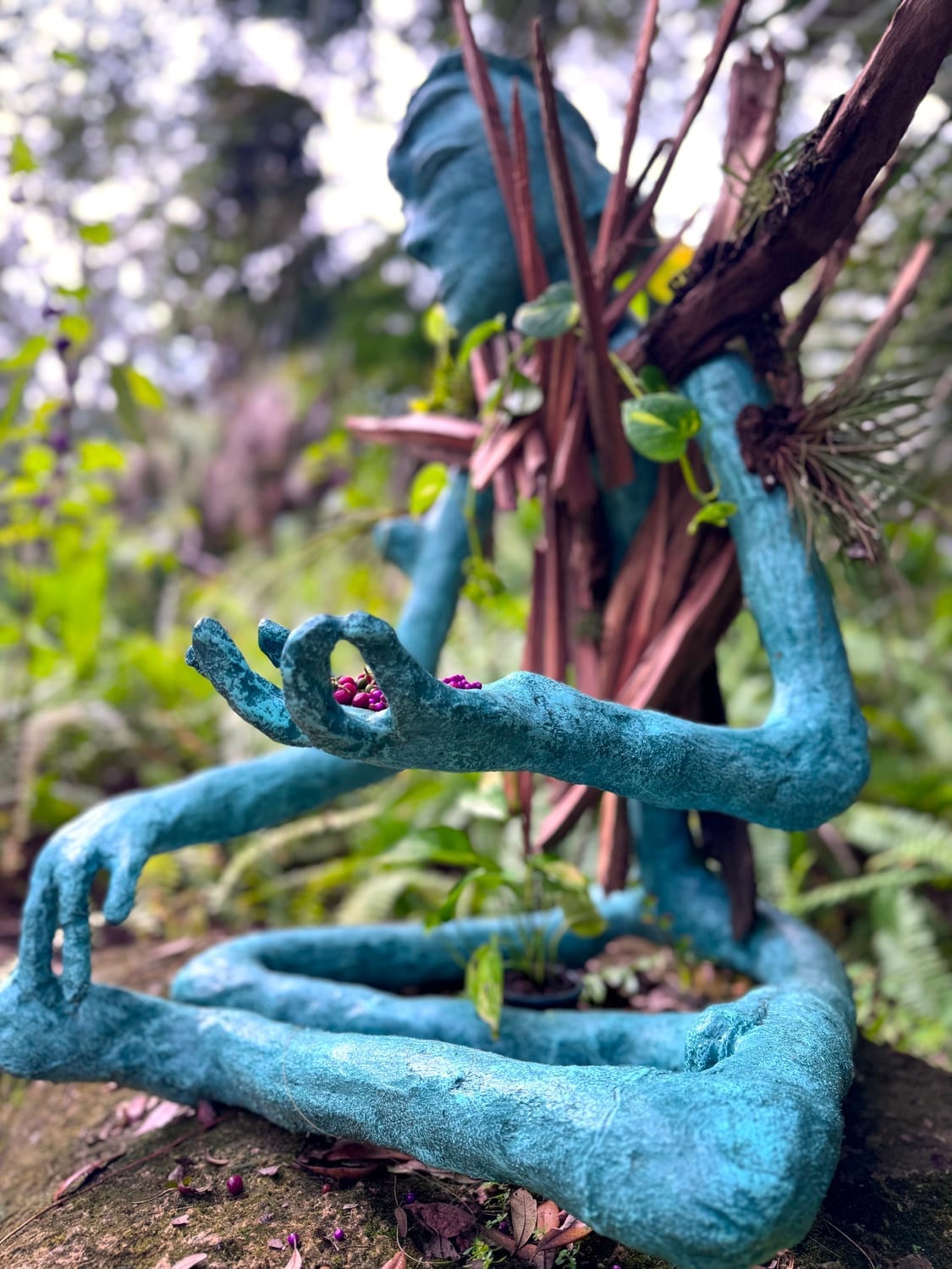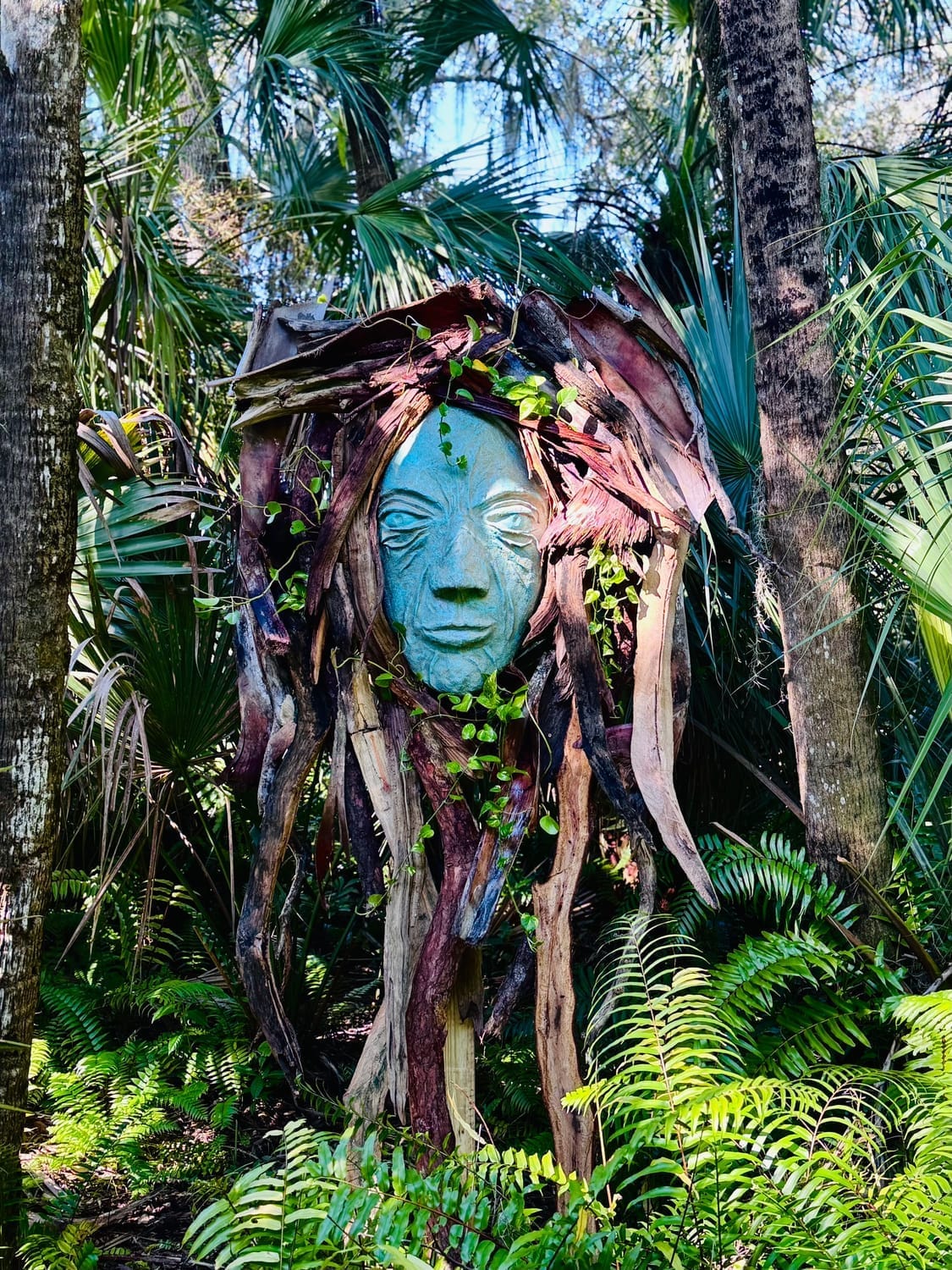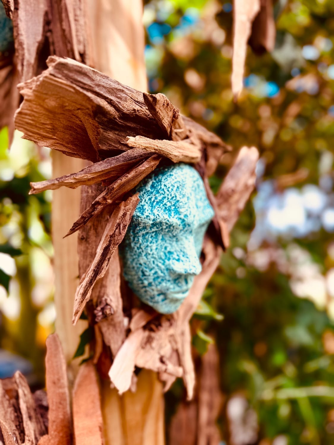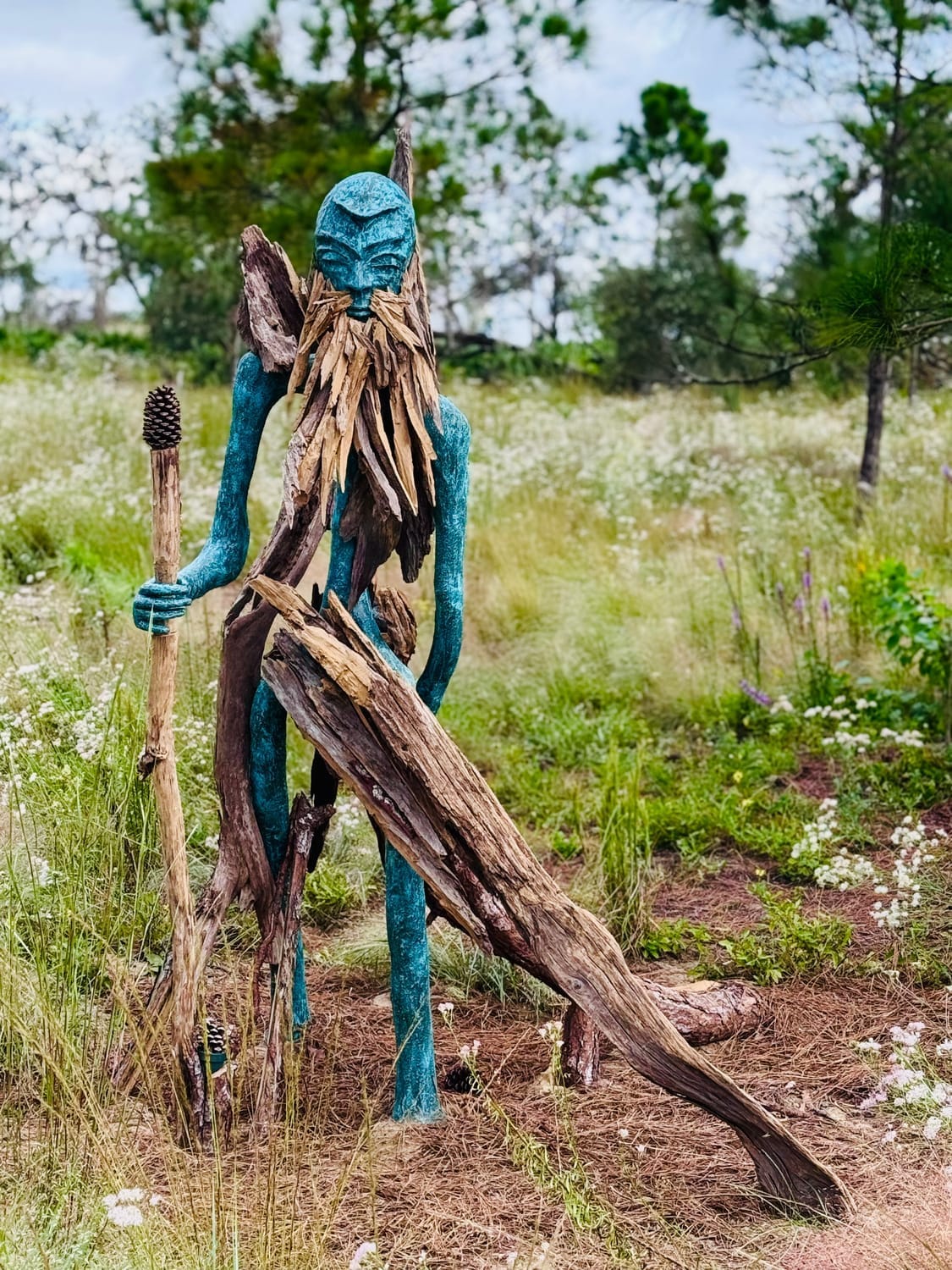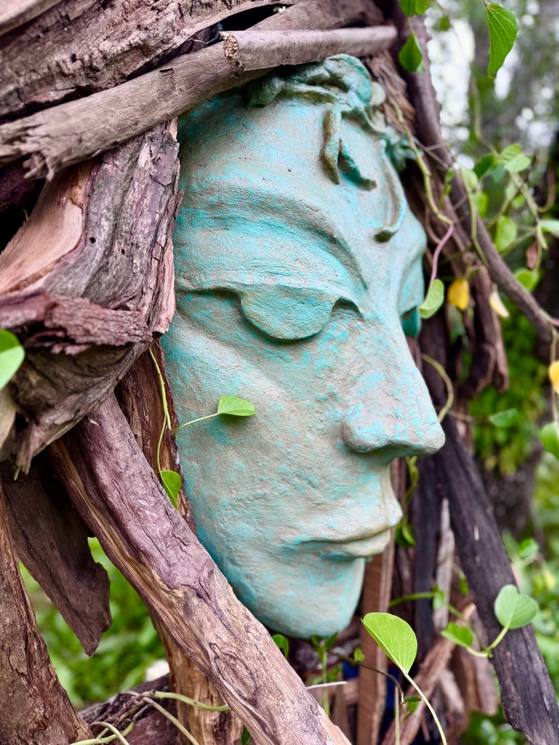 driftwood, clay, Pal Tiya clay, cement, rapid-set, paint, framed on treated wood.